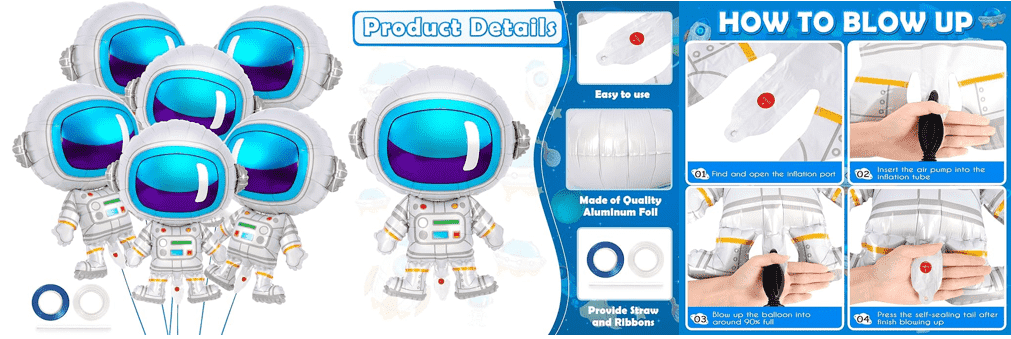 အာကာသယာဉ်မှူး သတ္တုပြားပူဖောင်းသည် သေးငယ်ပြီး လက်ရာမြောက်ပြီး တည်ဆောက်ရလွယ်ကူသည်။ ၎င်းသည် ပါတီ၏အလယ်ဗဟိုတွင် အာကာသယာဉ်မှူးကို နေရာပေးကာ ဂြိုဟ်မီးပုံးပျံက ၎င်းကို ဝန်းရံထားသည်။ ကြယ်များသည် ရှုပ်ထွေးသောကိရိယာများမပါဘဲ နှစ်ဖက်စလုံးတွင် ပန်းများကို ဆွဲယူကြသည်။ သေးငယ်သောဝတ်စုံသည် မိသားစုငယ်များ မွေးနေ့ပါတီများနှင့် ကလေးအခန်းများအတွက် နေ့စဉ်အလှဆင်ရန် သင့်လျော်သည်။ ၎င်းသည် တောက်ပသော အာကာသလေတိုက်သည့် နာရီလက်တံဖြစ်သည်။