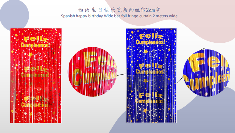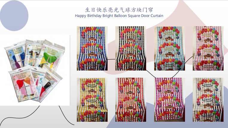 Macaroon အရောင်များနှင့်အခြားအရောင်ပေါင်းစပ်မှုများနှင့်အတူသတ္တုပါးကုလားကာသည်ကလေးများမွေးနေ့ပွဲများအတွက်သင့်တော်သည်။ အရွယ်ရောက်ပြီးသူမွေးရာပါတီများ, နှစ်ပတ်လည်ပွဲအခမ်းအနားများအတွက်သင့်တော်သောရွှေနှင့်ငွေကဲ့သို့သောရွှေရောင်ကုလားကာများလည်းရှိသည်။ ၎င်းတို့သည်ပါတီ၏ဆိုဒ်များ, ဟိုတယ်စားသောက်ခန်းမများတွင်စီစဉ်နိုင်သည်။