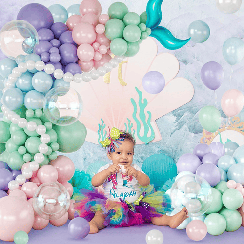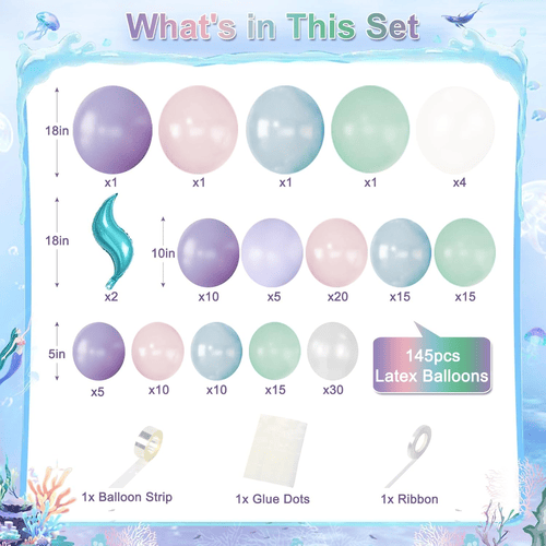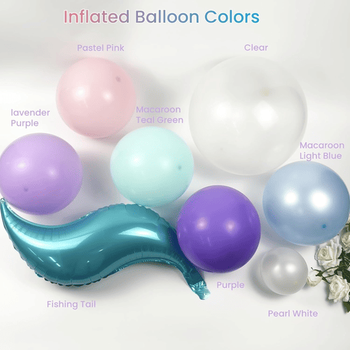 Mermaid balloon ပန်းကုံးရှိ ပူဖောင်းများတွင် ခရမ်းရောင်၊ လာဗင်ဒါ၊ ပန်းရောင်၊ pastel ပန်းရောင်၊ အပြာနုရောင်၊ စိမ်းပြာရောင်၊ စိမ်းပြာရောင်၊ ပုလဲဖြူနှင့် ဖောက်ထွင်းမြင်နိုင်သော အရောင်မျိုးစုံဖြင့် ပါ၀င်သည်
