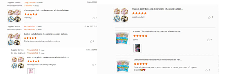အထုပ်အတွက် သတ္တုအရောင် တစ်မျိုးတည်းကို သင်ရွေးချယ်နိုင်သည်။ လူကြိုက်များသောရွေးချယ်စရာများမှာ ရှန်ပိန်ရွှေ၊ သတ္တုစိမ်း၊ နှင်းဆီရွှေ အစရှိသည်တို့ဖြစ်သည်။ ၎င်းသည် သင့်မြင်ကွင်းကို ရိုးရှင်းပြီး ပေါင်းစပ်ခံစားရစေသည်။ ဆန့်လို့ကောင်းပါတယ်။ ပေါ်လာခဲတယ်။ ငွေကြေးဖောင်းပွပြီးနောက် 12 နာရီကျော်ကြာအောင် ပြည့်နေပါသည်။ ကွဲပြားခြားနားသောသတ္တုအရိပ်များကိုရောနှောနိုင်သည်။ ရွှေငွေ အတူတူကြိုးစားပါ။ ၎င်းသည် အလွှာလိုက်၊ ဖမ်းစားနိုင်သော အပြင်အဆင်ကို ဖန်တီးပေးသည်။ ဤပူဖောင်းများကို စက္ကူစေးပူဖောင်းများနှင့်လည်း တွဲပေးပါ။ သတ္တုရောင်ပူဖောင်းများ၏ ချောမွေ့တောက်ပမှုသည် ရောင်စုံစက္ကူပုံသဏ္ဍာန်နှင့် ဆန့်ကျင်ဘက်ဖြစ်သည်။ သူတို့ကို လှုပ်ခါလိုက်တဲ့အခါ စာရွက်တွေက အတွင်းဘက်ကို ရွေ့နေတယ်။ ၎င်းသည် မည်သည့်နေရာမဆို ပျော်ရွှင်မှုနှင့် လှုပ်ရှားမှုကို တိုးစေသည်။ သတ္တုရောင်ပူဖောင်းလေးတွေက မွေးနေ့ပါတီတွေ၊ မင်္ဂလာဆောင်တွေ၊ အားလပ်ရက်ပွဲတွေနဲ့ စတိုးဆိုင်ပြတင်းပေါက်တွေအတွက် အလုပ်လုပ်ပါတယ်။ အစုံလိုက်တိုင်းသည် တင်းကျပ်သော လေဝင်လေထွက်ကောင်းခြင်း နှင့် ဘေးကင်းရေး စစ်ဆေးမှုများကို ပြီးသည် ။ ၎င်းသည် EN71 နှင့် CE ကဲ့သို့သော နိုင်ငံတကာစံနှုန်းများနှင့် ကိုက်ညီပါသည်။ ၎င်းတို့ကို ဖောင်းကားရန်မှာ လွယ်ကူသည်။ DIY အတွေ့အကြုံမရှိသေးသူများပင် ၎င်းတို့ကို အသုံးပြုနိုင်သည်။ ပရော်ဖက်ရှင်နယ် ပွဲစီစဉ်သူတွေကိုလည်း နှစ်သက်ကြပါတယ်။ အံ့သြဖွယ်လေထုနှင့်အတူ အာကာသကို သင်ဖန်တီးနိုင်မည်ဖြစ်သည်။