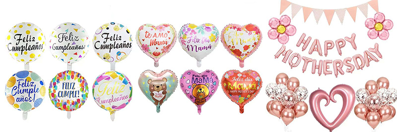1 ။ မိခင်များနေ့အလှည့်ဖောင်းအလှည့်ဖောင်း:မိခင်များနေ့အလှဆင်ထားသောအလှဆင်ခြင်းသည်အားလပ်ရက်စိတ်ဓာတ်ကိုအသုံးပြုရန်ရွေးချယ်စရာများဖြစ်သည်။ သူတို့ဟာဂန္ထဝင်ပုံသဏ် on ာန်အပေါ်အခြေခံပါတယ်။ သူတို့၏မျက်နှာပြင်များသည်ရှင်းလင်းသောအရောင်ပုံနှိပ်လုပ်ငန်းကိုအသုံးပြုသည်။ ဤအမေများနေ့၏နေ့ကသတ္တုပါးပူဖောင်းများကို "မင်းကိုငါချစ်တယ်။ " နဲ့ "Feliz díaMamá" သူတို့မှာသူတို့အပေါ်မှာချစ်စရာကောင်းတဲ့ပုံစံတွေအများကြီးရှိတယ်။ အရောင်များသည်တောက်ပနေပြီးအလွယ်တကူမှေးမှိန်သွားကြသည်မဟုတ်။ ပျော့ပျောင်းသောသတ္တုတောက်ပသောအလင်းရောင်သည်မီးခိုးများကိုအလင်းရောင်ပေးသည့်အခါပူဖောင်းများကိုကြည့်စေသည်။
