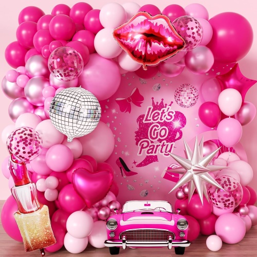 အစုံတွင် 5 လက်မနှင့် 12 လက်မ matte ပန်းရောင်အစေးပူဖောင်းများ၊ 5 လက်မနှင့် 12 လက်မပုလဲပန်းရောင်အစေးပူဖောင်းများ၊ 5 လက်မနှင့် 12 လက်မသတ္တုပန်းရောင်အစေးဘောလုံးများ၊ 5 လက်မနှင့် 12 လက်မအဖြူရောင်အစေးပူဖောင်းများ၊ 12 လက်မပန်းရောင်ရောင်စုံစက္ကူအစေးပူဖောင်းများ၊ 18 လက်မပန်းရောင်ဘောလုံး 18 လက်မ နှင့် အဖြူ သတ္တုပြား ကုလားကာ၊ ပန်းရောင် မွေးနေ့တွင် သတ္တုပြားပူဖောင်းများ၊ ကော်အစက်များ၊ ပူဖောင်းများနှင့် ဖဲကြိုးများကဲ့သို့သော လိပ်ပြာအလှဆင်ပစ္စည်းများနှင့် ဆက်စပ်ပစ္စည်းများ။